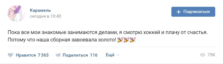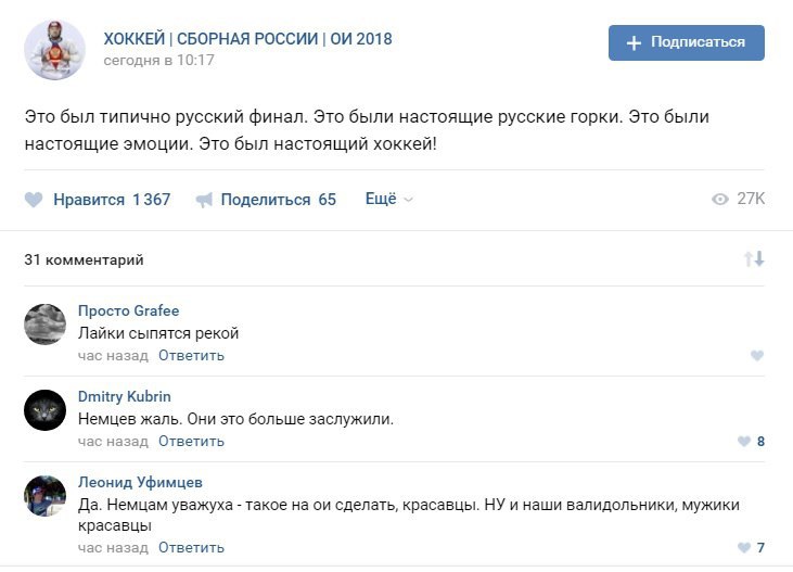 Российская сборная по хоккею, точнее, "сборная атлетов из России" взяла олимпийское золото в хоккее. Мы выиграли у Германии, которая сотворила сенсацию на этой Олимпиаде, победив сильных шведов и канадцев. Перед финалом многие российские болельщики радостно потирали руки - мол, "это будет легкая победа", "немцы - аутсайдеры", "это вам не футбол", "отвозим" их всухую" и т.п.